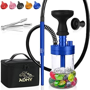 ADMY Mini Shisha Set, Klein Hookah Komplett Alu, Shisha To Go Paket | Wasserpfeife Steinkopf mit Edelstahl Kaminaufsatz | Glas Bowl | Silikonschlauch mit Mundstück | Zange | Travel Bag | Blau