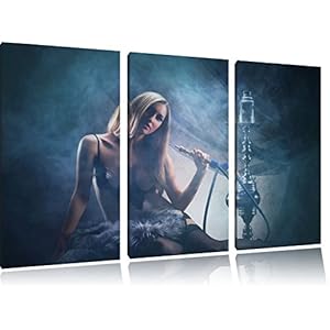 Pixxprint Schöne Frau mit Shisha als Leinwandbild/Größe: 3 Teilig (120×80 cm) cm/Wandbild/Kunstdruck/fertig bespannt