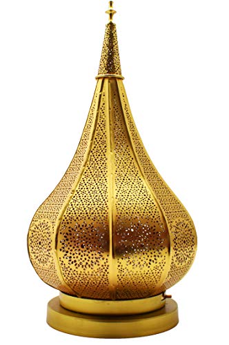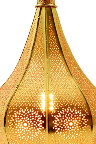 Indische Orient Nachttischlampe Gold von außen und Kupfer von innen Tropfenform, Schillerndes Design fängt das Licht auf und reflektiert es für einen wunderschönen Effekt, Die Perforationen zaubern orientalische Schattenspiele in ihren Kosmos | Schillerndes, warmes, beruhigendes, sanftes und romantisches Licht für eine entspannte und romantische Atmosphäre.