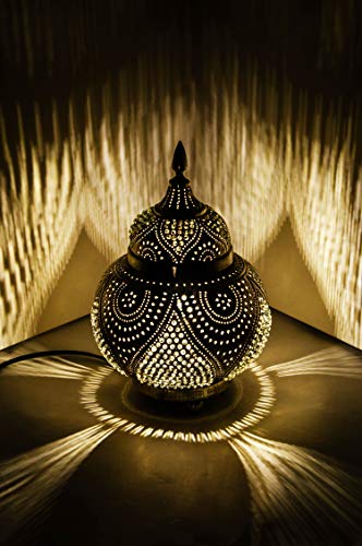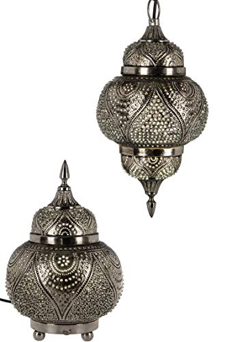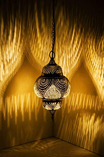Arabische Deckenlampe & Tischlampe 100% Handarbeit aus Indien, Lampenschirm ist aus Messing silberfarben von außen und von innen in Tropfenform, Schillerndes Design fängt das Licht auf und reflektiert es für einen wunderschönen Effekt, Die Perforationen zaubern orientalische Schattenspiele in ihren Raum | Schillerndes, warmes, beruhigendes, sanftes und romantisches Licht für eine entspannte und romantische Atmosphäre.
