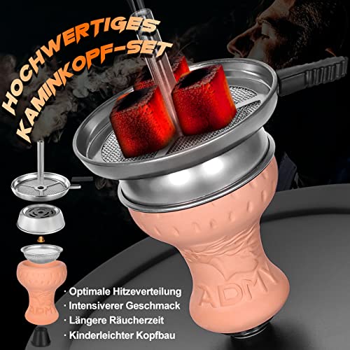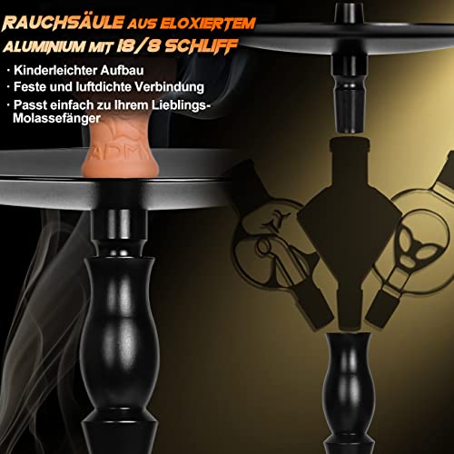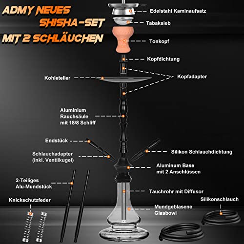 [Premium Shisha Komplettset]: ADMY Shisha Set besteht die Gesamtheit eloxiertem Aluminium, und ist folglich robust, langlebig, rost- und kalkfrei. Dank dieses hochwertigen Materials und der starken Glasbowl wirkt die Wasserpfeife besonders erlaucht und schön und ist reiner Geschmack und Rauchgenuss garantiert.
