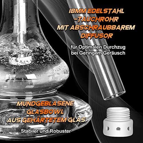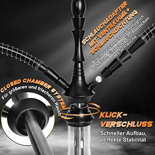 [Wunderbare Struktur]: Das Wasserpfeife Set ist mit einer Closed Chamber Base ausgestattet und hat ein Click-Verschluss-System, dadurch kann der gesamte Rauch aus der Bowl geblasen werden. Die Rauchsäule mit 18/8-Schliff sorgt für die Stabilität der Shisha und kann mit einem Molassefänger installiert werden. Das Schlauchadapter-Set mit Silikondichtung sorgt für die luftdichte Verbindung und erleichtert das Ein-/Abstecken des Schlauchs.