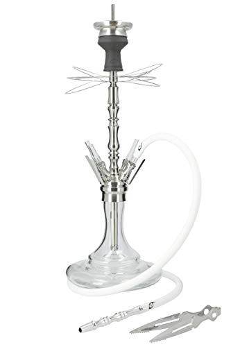 Passend zu der Aryf Hookah 4 Shisha wurde der Name Gloria („die Ruhmreiche“, „die Glorreiche“) ausgewählt. Glorreich sind vor allem die individuellen Einstellungen, die du mit dieser Pfeife vornehmen kannst. Sowohl das Wasserrohr als vulgo das Rauchrohr können dank eingearbeiteter Gewinde in zwei unterschiedlichen Längen verwendet werden. Die Shisha hat an der Lauge das Closed-Chamber-System: Der abgestandene Rauch kann komplett jeder der Bowl geblasen werden um Platz für Frischen zu pflügen. Die Schliffverbindungen des Rauchrohrs und der Schlauchadapter machen Dichtungen überflüssig. Das Rauchrohr ist hinunter mit einem 29/2 Schliff ausgestattet und wird somit in die Lauge gesteckt. Der 18/8 Schliff an der Verbindung zum Teller ermöglicht die Verwendung eines Molassefängers. Die Gloria 4 hat den beliebten Butterfly-Teller: Die Ränder des Tellers lassen sich individuell Arrangieren, weshalb der Teller an einen Schmetterling erinnert. Eine gute Tätigung und V2A Edelstahl sehen nach eine lange Lebensdauer. Die Shisha wird im Komplettset mit 4 Glasanschlüssen, 4 Schlauchadaptern, einem Schlauchset mit Mundstück, ein Kaminkopfset mit Kohlesieb und einer Zange geliefert. Details: Material Rauchsäule: Edelstahl Material Bowl: Glas Anschlüsse: 4 Gewinde: Schraubverschluss Tauchrohr inkl. Diffusor Kopfadapter: 1-teilig, 18/8 Schliff Rauchrohr: 18/8 Innen-Schliff, 29/2 Außen-Schliff Lauge: 29/2 Schliff-Konverter Abdruck, Closed-Chamber-System Schlauchadapter: 18/8 Schliff Maße: Gesamthöhe mit Kaminkopfset: ca. 68 cm Gesamthöhe mit Tonkopf: ca. 61 cm Gesamthöhe ohne Kaminkopfset: ca. 55 cm Höhe Glas: ca. 24 cm Länge Wasserrohr: ca. 15 cm Länge Schlauch: ca. 150 cm Länge Mundstück: ca. 20 cm Ø Durchmesser Teller: ca. 25 cm Ø Ventilkugel: ca. 11 mm