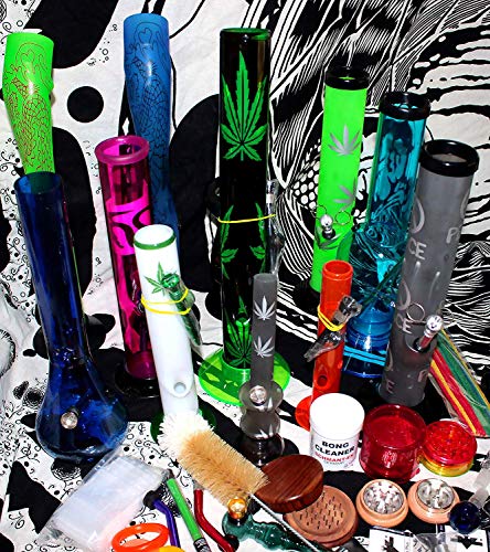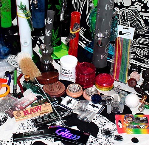 Jedes Paket besteht leer mindestens einer Acryl-Bong (Höhe ca. 25-35 cm) und einer kleineren Bong mit einer Höhe von ca. 10 – 20 cm. Des weiteren kann das Paket folgendes beinhalten: Grinder, Pur-Pfeife, Feuerzeug, Spoon Siebe und Vermischtes Kleinteile wie zum Beispiel Papers, Filter, Bürsten, Glas-Pfeifen, Shisha, Vermischtes Holz oder Speckstein Köpfe.