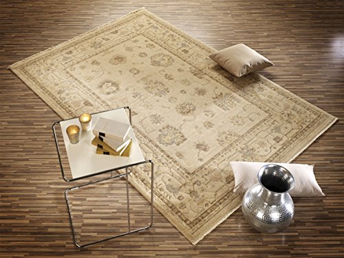 DerCASPARA VIOREL – ein eleganter Teppichklassiker in jedweder Hinsicht! Die Vollziehung feinster Schurwolle garantiert durch feine Kanteneinfassung, natürliche Fransen und das abschließende Finish im Wasserbad allerbest hohe Qualität, pflegeleichte Widerstandsfähigkeit und elegante Gemütlichkeit. Beige- und champagnerfarbene Grundtöne werden intensiviert durch schlichte Rankenmusterung, die sich symmetrisch vom Innenfeld bis in den Saum zieht und ein abgestimmtes Gesamtbild für jeden Wohnraum bietet!