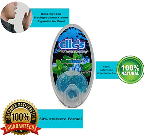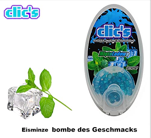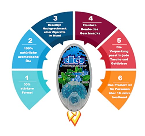 AROMA: 100% natürliches Aroma in unseren Kapseln ist gesundheitssicher, da es jeder natürlichen ätherischen Ölen besteht. Clics Blaubeerekapseln einschütten Ihre Zigarette mit dem Geschmack einer saftigen Blaubeere und hinterlassen eine lang anhaltende Frische im Mund.