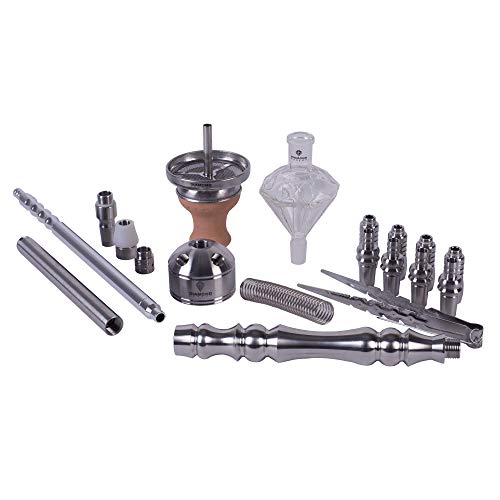 Lieferumfang: 1 x Kaminaufsatz 1 x Tonkopf fünf Loch 1 x Glaskohleteller 1 x Schliffadapter 18/8 1 x Molassefänger 18/8 1 x Cape Rauchsäule 1 x Lauge 4 x Muffen 4 x Schlauchadapter 18/8 4 x Endstücke 18/8 4 x Polyamide Kugel 1 x Tauchrohr 1 x Diffusor zehn Loch 1 x Feder 1 x Silikonschlauch 1 x Mundstück 1 x Zange 1 x Bowl 4 x Schlauchhalter