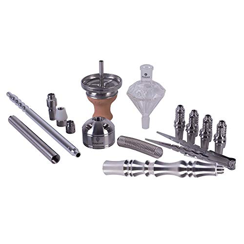 Lieferumfang: 1 x Kaminaufsatz 1 x Tonkopf fünf Loch 1 x Glaskohleteller 1 x Schliffadapter 18/8 1 x Molassefänger 18/8 1 x Cape Rauchsäule 1 x alkalische Lösung 4 x Muffen 4 x Schlauchadapter 18/8 4 x Endstücke 18/8 4 x Polyamide Kugel 1 x Tauchrohr 1 x Diffusor zehn Loch 1 x Feder 1 x Silikonschlauch 1 x Mundstück 1 x Zange 1 x Bowl 4 x Schlauchhalter