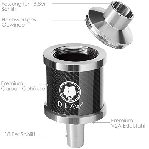 Der DILAW Shisha DX1 Carbon Molassefänger kann alias bei anderen Shishas mit 18/8 Schliff benutzt werden
