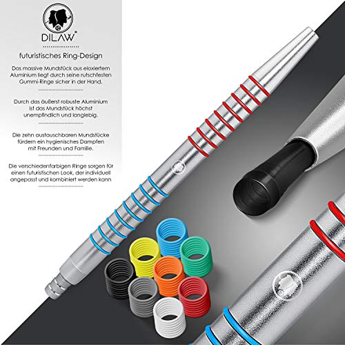 ✓ VORTEILE – Gummi-Multi-Ring-Design ,verschiedenfarbigen Ringe , Passt auf jedweder gngigen Schlauchgrößen , Inkl. robustem Schlauchhalter, Inkl.Hygiene-Mundstücke , Premium Materialien , Beste Tätigung , eloxietes Aluminium. Das DILAW Alu Mundstück liegt perfekt in deiner Hand.