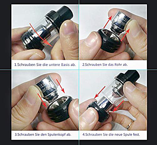 ?dieser Verdampfer ist sicher,lecklos und leicht auffüllbar.Die Spule ist einfach zu wechseln: Verdampfer mit Kindersicherheitsschloss, sicher und zuverlässig, Füllung des Rauchöls von oben macht die Füllung leichter. Durch Lufteinlass aus unten und Luftregulierung am Boden leckt der Verdampfer gar nicht und erzeugt feiner Geschmack, der hochprozentig zu dem natürlichen Geschmack des Rauchöls nähert. Das Mundstückwird aus wärmeisolierten Polymer-materialien hergestellt und ist somit wämeisolier