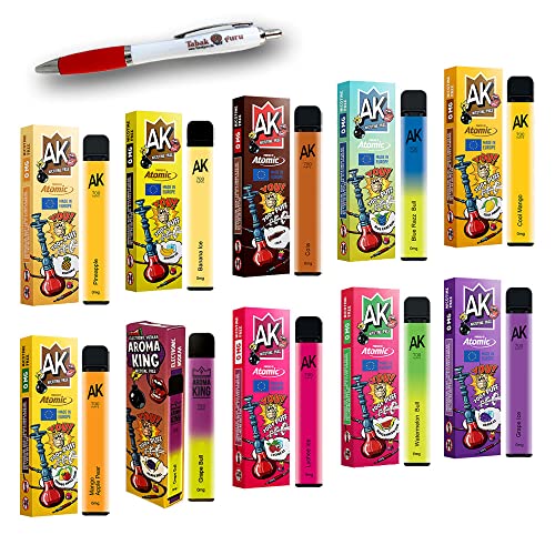 10 x Aroma King/AK Einweg E-Shisha PROBIERSET 0mg, E-Zigarette anstatt je 700 Züge + 1 Original Tabakguru Kugelschreiber Die Einweg E-Shisha mit fantastischem Geschmack in 10 verschiedenen Sorten! Jede dieser kompakten Einweg E-Shishas erlaubt ca. 700 Züge und hat eine Akkukapazität von 550 mAh. Auspacken und loslegen! In diesem Probierset sind 10 verschiedene Sorten enthalten: COLA: Cola BANANA ICE: eisige Banane GRAPE BULL: Traube & Energy Drink BLUE RAZZ BULL: Brombeere + Energy Drink COOL MANGO: Mango MANGO APPLE PEAR: Mango, Apfel und Birne PINEAPPLE: Ananas LYCHEE ICE: eisige Litschi WATERMELON BULL: Wassermelone & Energy Drink GRAPE ICE: eisige Traube Marke: Aroma King / AK Abmessungen: ca. 10,5 cm hoch und ca. 1,5 cm Durchmesser Nikotingehalt: 0mg Inhalt: 10 E-Shishas Zutaten (laut Verpackungsangaben): Pflanzliches Glycerin 50%, Propylenglykol 50%, verschiedene Aromen. Kann Spuren von NÜSSEN enthalten. Sicherheitshinweise: Außerhalb der Reichweite von Kindern und Haustieren aufbewahren. Bei Kontakt mit der Haut gründlich mit Wasser und Seife spülen. Kann eine allergische Reaktion anmachen. Bei Raumtemperatur vor direkter Sonneneinstrahlung geschützt deponieren. Original Tabakguru Kugelschreiber: Die Kugelschreiber gibt es in unterschiedlichen Farben und Ausführungen. Die Zustellung erfolgt akzidentiell, je nach Verfügbarkeit. Produkthinweise: Die Verpackung der gelieferten Ware kann von der abgebildeten Verpackung abschweifen, darauf haben wir leider keinen Einfluss, da der Hersteller jedweder Zeit das Verpackungs-Design konvertieren kann.