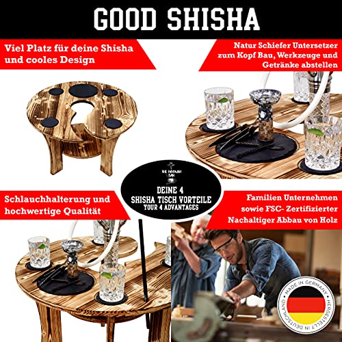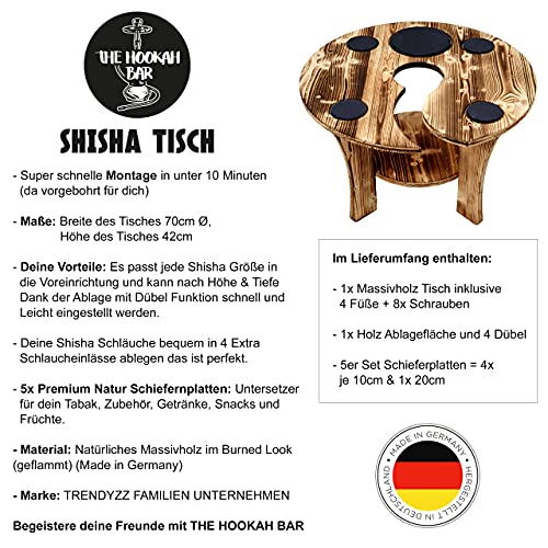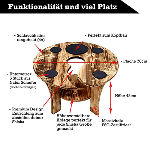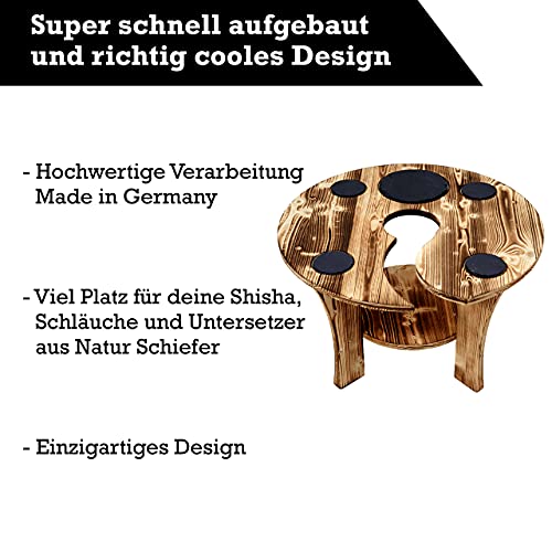Premium Tisch aus Massivholz in Made in Germany hergestellt. Der Tisch ist beflammt worden und inklusive Schieferplatten ( 4x 10cm Rund und 1x 20cm Rund ) ideal für das Ausmachen deiner Bowle und perfekt für Getränke. Die Kellern für deine Bowle kannst du jederzeit tauschen und es passt jede Größe rein. Der Tisch ist hochwertig und mit Schlauchhaltern ausgestattet hier kannst deinen Schlauch entspannt einlegen und mit deinen Freuden genießen und chillen. Unsere Marke TRENDYZZ ist stolz diesen coolen Tisch hergestellt erwerbbar. Wir wünschen dir und deinen Freunden massenhaft Spaß
