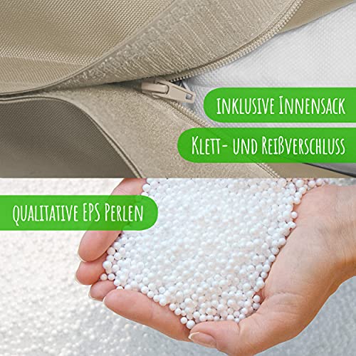 ✅ ERGONOMISCHES MULTITALENT: Dank der flexiblen EPS Perlen Füllung passt sich das Füllmaterial Ihrer Körperhaltung und Körperform perfekt an und unterstützt Sie bei der richtigen Sitzhaltung. Eine stabile Rückenlehne lässt sich formen, so dass Ihr Körper ganzheitlich gestützt ist. Die sonst auftretenden Verspannungen werden somit auch nach langem Sitzen vermieden. Der Reißverschluss lässt sich mit dem integrierten Klettverschluss verstecken und ist somit vor Einflüssen von außen geschützt.