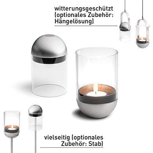 ZUBEHÖR: Für die GRAVITY CANDLE M90 ist vielfältiges Zubehör erhältlich. Mit der Hängelösung können Sie die Windlichter elegant und einfach aufhängen. Der GRAVITY CANDLE Stab kann wie Erdstab dienen oder gemeinsam mit dem GRAVITY CANDLE Fuss und der Kerze wie Stehlampe verwendet werden