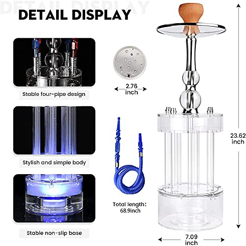 4 Schlauchhaken Set: Acryl Wasserhukahn-Tank, Aluminiumstiele mit einem Diffusor, Glasaschenbecher, 4 Bruchstück 59 „Seidenhakenschlauch, Keramik-Hukahnschüssel, Holzkohlezangen, LED-Licht und Fernbedienung.