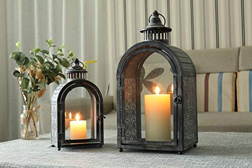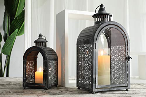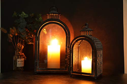 【UNIVERSALGRÖSSE FÜR DIE MEISTEN GELEGENHEITEN】- Verwendet Teelicht, Votiv oder kleine Stumpenkerzen mit einem Durchmesser von bis zu 7,5 cm. x 10 cm H & 10 cm Durchmesser x 15 cm H. 19 cm L x 15 cm B x 42 cm H, 46 cm hoch mit Schlaufe & 14 cm L x 11 cm B x 28 cm H, 30 cm hoch mit Schlaufe. Eisen und Glas.