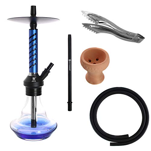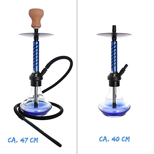 Komplettes Set mit einer Kaya Shisha Wasserpfeife aus eloxiertem Aluminium. Materialbedingt geschützt vor Rost und Kalkablagerungen. Gesamthöhe: ca. 47cm | ohne Kopf und Zubehör ca. 40 cm |Schliff für Molassefänger: 18.8 mm