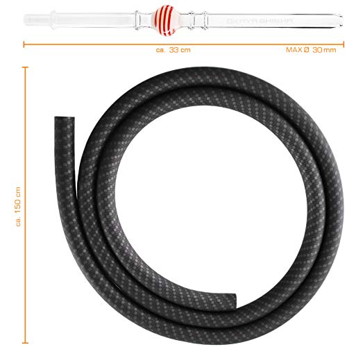 Mehrteiliges Wasserpfeifen-Zubehör Set – Dieses Schlauch-Set enthält je ein Lolly Mundstück aus Glas, einen schwarzen Silikonschlauch mit Carbon Print [150 cm Gesamtlänge] einen Knickschutz und einen Lolly Schlauchadapter mit 18.8 mm Glasschliff