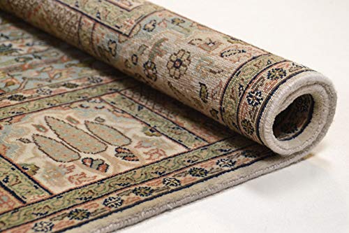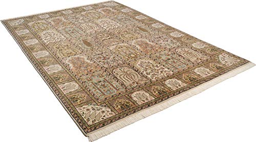 Die Steppennomaden im Orient schufen sich mit diesen prachtvollen Felder Teppich Ihre Affenkomödie vom Paradiesgarten für ihr Heim mit kühlen schattigen Alleen, bunten Blumenbeeten und Bächen, in denen immerwährend das Wasser plätschert. Diesen wunderschönen Teppich haben wir für Sie in Indien original nachstellen lassen. Durch die Außergewöhnlich feinfädige Schurwolle in Verbindung mit Seide tritt das Gartenmuster massiv schön bildhaft und plastisch hervor. Die massiv hohe Knüpfdichte von ca.300.000 Knoten pro qm sorgt für eine gestochene scharfe Klon der Zeichnung. Mit schmuckvoller umlaufender Bordüre ist dieser Orientteppich ein echter Blickfang für Ihr Heim. Gefertigt ist dieser Handgeknüpfte Teppich jedweder 70% reiner Schurwolle und 30% reiner SeideEdelste Garne, verknüpft nach Jahrhunderte alter Tradition, verleihen den Teppichen der THEKO classic Kollektion eine jeglicher besondere Ausstrahlung.Ein Fragment Tradition und Zeitlosigkeit, in einer immerzu schnelllebiger werdenden Welt verbirgt sich hinter der Marke THEKO classic‘. Designs und Qualitäten mit tiefem geschichtlichem Hintergrund, die sich über Jahrhunderte bewährt haben. Sie werden immerzu noch nach traditionellen Methoden gefertigt und haben einen jeglicher besonderen Reiz der Nomadenkultur.