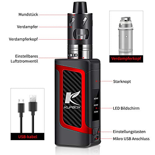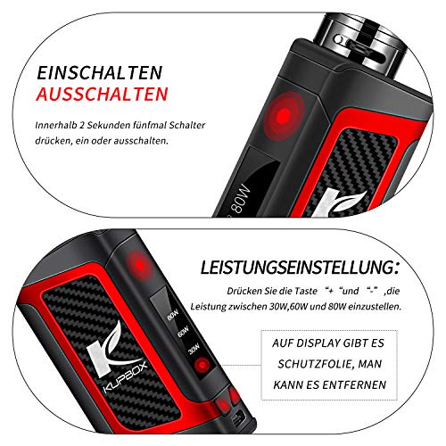Einschalten/Abstellen:Betätigen Sie den Schalter kontuierlich 5 mals innerhalb 2s. Durch zwei Tasten kann man zwischen 30W,60Wund 80W regeln. Hinweis:Ohne E Liquids darf man nicht Schalter betätigen,um Trockenverbrennung zu vorbeugen. Vor erster Verwendung lesen Sie sorgfältig die Bedienungsanleitung bitte.