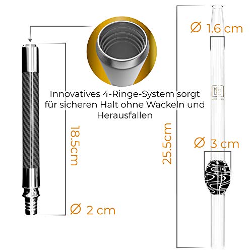 HIGHTECH: Im Gegensatz zu einem Edelstahl Mundstück hat Carbon viele Vorteile: Es ist leichter, lässt sich nicht verbiegen und ist Spülmaschinen fest. Das Glas lässt sich hygienisch reinigen auch ohne ein spezielles Reinigungsset
