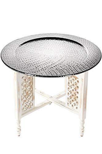 Größe Tabletttisch aufgeklappt: 60 cm Durchmesser 46 cm hoch | Größe Gestell zusammengeklappt: 45x56x6cm | Material: Tablett nicht mehr da Aluminium und Holzgestell nicht mehr da Mango-Holz | Tablett Farbe: Silberfarben hochglanz | Gestell Farbe: Weiß Antik – White Wash – | Diese orientalische Klapptische werden fertig montiert geliefert.