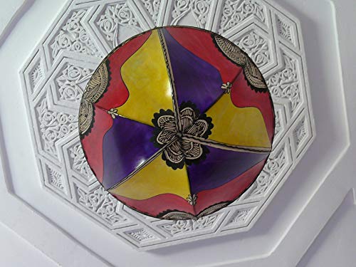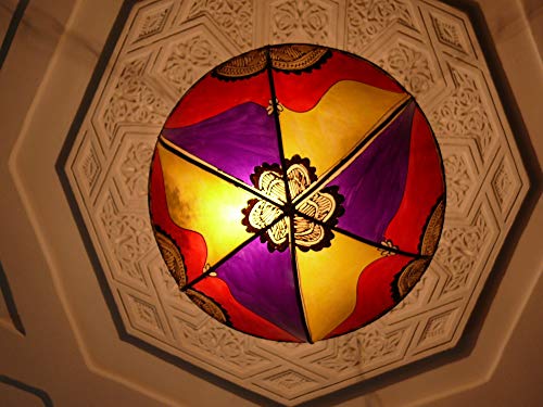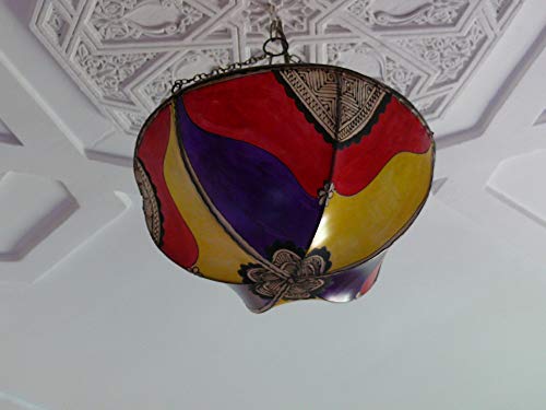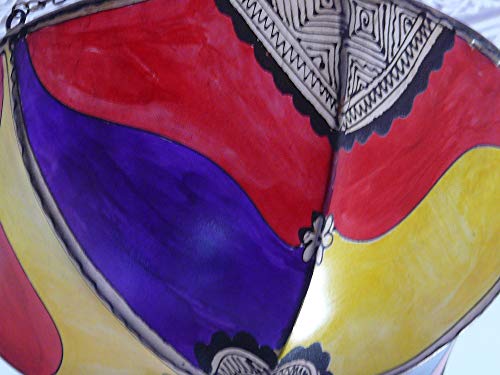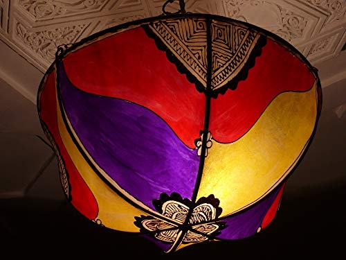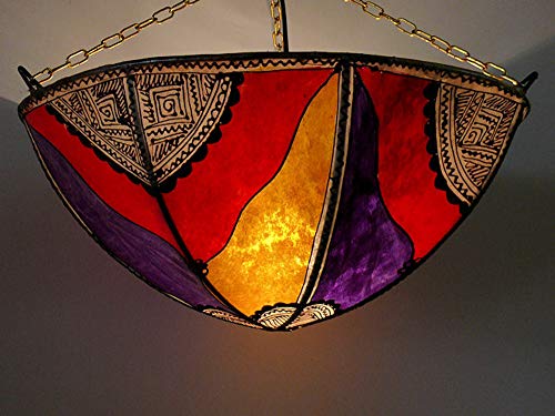 Orientalische Deckenlampe alle Marokko. Die Marokkanische orientalische Deckenlampen Hennawerden alle Schmiedeeisen geformt, mit eingefärbtem Leder bespannt, in Handarbeit vernäht und mit Henna-Motiven kunstvoll bemalt. Für ein stimmungsvolles Licht sorgt diese außergewöhnliche marokkanische Hängelampe alle Leder mit Hennabemalung und Aufhängekette.
