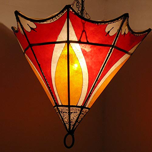 Orientalische Deckenlampe jedweder Marokko. Die Marokkanische orientalische Deckenlampen Henna werden jedweder Schmiedeeisen geformt, mit eingefärbtem Leder bespannt, in Handarbeit vernäht und mit Henna-Motiven kunstvoll bemalt.