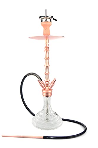Mata Leon Aluminiumshisha, Amboss Pigue (roségold), eloxiert, qua eingebautem 18/8er Schliff sondern Molassefänger, qua Klick- ansonsten Closed Chamber Naturell inkl. vier 18/8er Schliff Schlauchanschlüssen ansonsten Endstücken, inkl. Silikonschlauch, Alumundstück, Tonkopf, Kaminaufsatz ansonsten Zange, Styroporbox, Berg ca. 70 cm