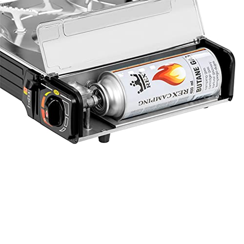 Flamme stufenlos regulierbar dank Drehknopf | Brennerkopf die Gesamtheit Alu | Windschutz, 2 flammig | stabiles Ganzmetallgehäuse mit abnehmbarer Topfstellfläche | Sicherheit dank Drucksensor | Befeuerungsart: Butan Gaskartusche (2 Fach) | Gaskartusche: MSF-1a 227g