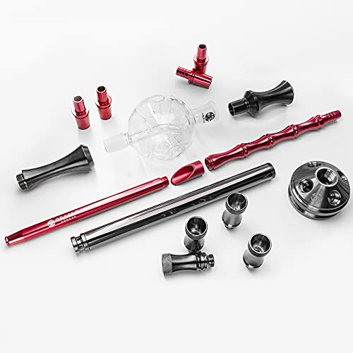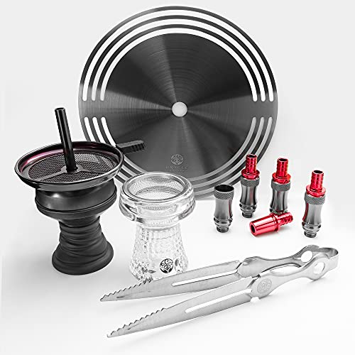 * AUSPACKEN UND LOSRAUCHEN – Das Set beinhaltet Glasbowl Mittels Click Gewinde – Edelstahl Tauchrohr Mittels Diffusor – Silikonschlauch – Leichtmetall Mundstück – Lauge Mittels 4 Anschlüssen u. a. 4 Schlauchadaptern – Rauchsäule — Molassefänger – Zange – Kaminaufsatz – Tonkopf – Glaskopf – Kohleteller – Kopfadapter – 10g Pulverfarbe .