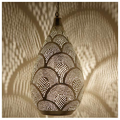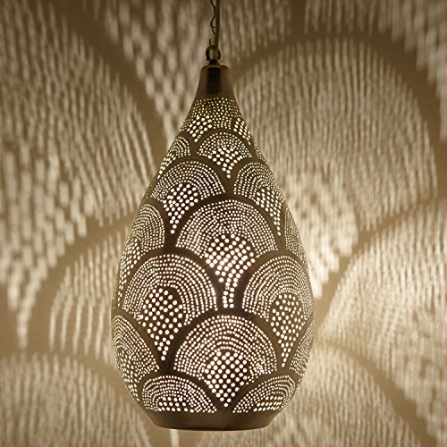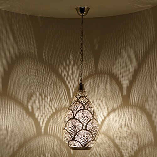 Die Hängellampe Naouma Samak D23 macht in nicht mehr da Ecke und in jedem Zimmer mit ihren verzaubernden Schattenwürfen eine gemütliche Atmosphäre! Ob über dem Esstisch, im Schlaf-oder Wohnzimmer, ob mediterran, orientalisch oder trendig- mit unserer versilberten Messing-Lampe begeben Sie sich auf eine Reise in den Orient und lassen sich verzaubern mit filigranen Schatten – ein Hingucker der in ihrem Wohnbereich nicht fehlen darf!