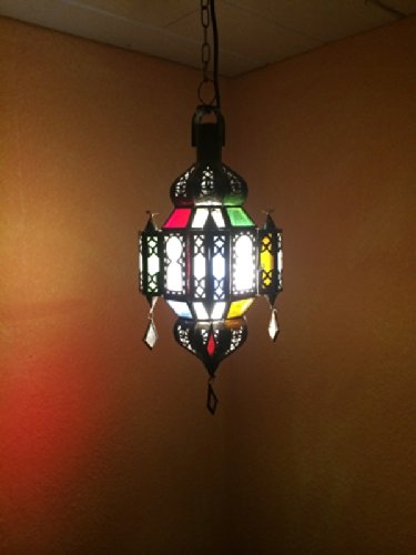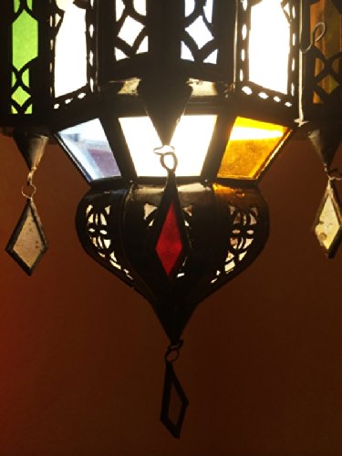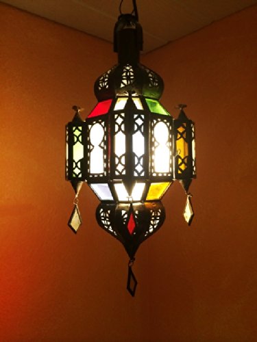 Größe: 35cm hoch und 18cm breit | Farbe Metall: Kupferfarben | Farbe Glas: Bunt – Grün Rot Weiss und Orange | Material: Metall – Eisen – galvanisiert | Diese Handgemachte Wohnzimmerlampe hat eine Leuchtquelle, Die Elektrik ist inklusive mit einer E14 Druckerzeugnis bis max. 40 Watt, Kabel 80cm lang, und eine Deckenbaldachine, Die Höhe ist verstellbar | Brauchbar für die E14 Leuchtmittel (LED, Glühlampe, Energiesparlampe) | Leuchtmittel ist nicht im Lieferumfang enthalten.
