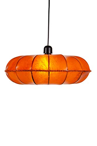 Größe: 48cm alkoholisiert und 15cm hoch | Farbe Leder: Orange | Material: Metall – Eisen – und echtes Leder | Diese Handgemachte Afrikanische Wohnzimmerlampe hat eine Leuchtquelle, Die Elektrik ist inklusive mit einer E14 Lampenfassung bis max. 40 Watt, Kabel 80cm lang, und eine Deckenbaldachine, Die Höhe ist verstellbar | Entsprechend für die E14 Leuchtmittel (LED, Glühlampe, Energiesparlampe) | Leuchtmittel ist nicht im Lieferumfang enthalten.