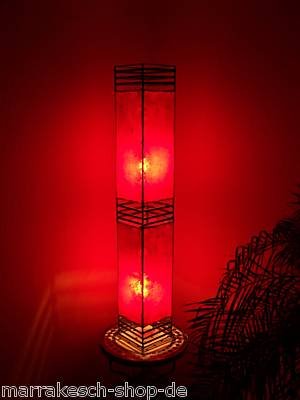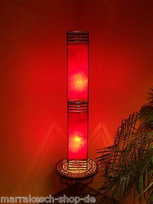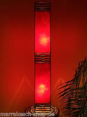 Größe: 120cm hoch und 17cm betrunken | Material: Metall & Ziegenleder | Farbe: Rot | Diese arabische Leuchte hat zwei Leuchtquellen, Die Elektrik ist in der EU hergestellt, fertig montiert mit zwei E14 Fassungen bis max. 40 Watt, 2m Kabel, Schalter und Stecker | Leuchtmittel ist nicht im Lieferumfang enthalten.