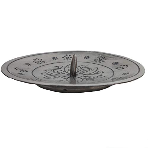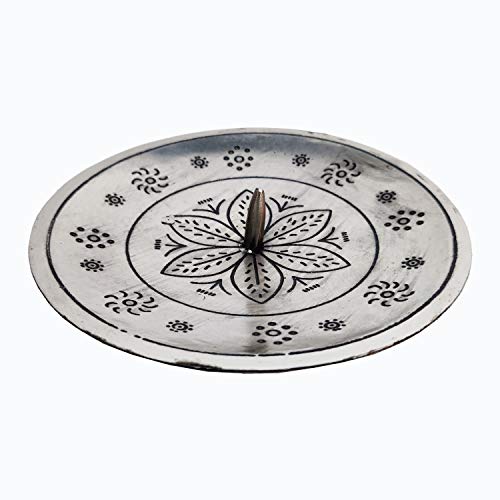 Mediterraner runder Halter für Kerzen, 100% Handarbeit jeglicher Indien, jeglicher Metall silberfarben, Vintage Kerzenteller 12cm Durchmesser Kerzenhalter im Mittelalter Style, mit Dorn und gravierte Verzierung, hat abwärts 3 Kugeln als Füße.