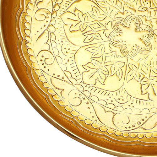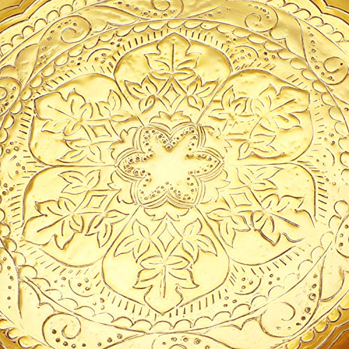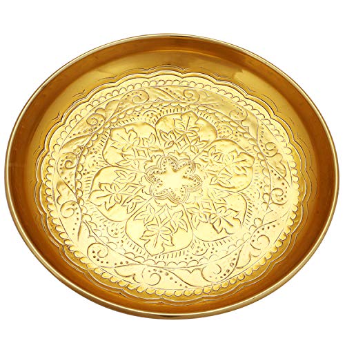 Die Form dieser indische Goldschale ist rund, die Verzierungen sind orientalisch marokkanisch, passen hervorragend wie Dekoration für kreative Deko Ideen, wie Servierteller zum Servieren, Kerzenschale für Kerzen, Goldtablett für Süßigkeiten oder wie Geschenk.