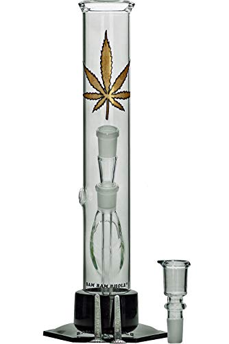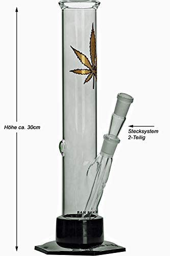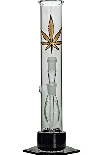 ✅ TOP: Zylindrische Glasbong von BamBamBhole in bester Qualität mit ‚Golden Leaf‘-Aufdruck. Ideal zum erweitern mit Vorkühler oder Aschefänger geeignet. Ohne Perkolator, der das Reinigen dagegen aufwändig und kompliziert gestaltet.