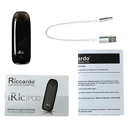 Im Lieferumfang: 1x iRic Pod System, 1x USB-C-Kabel, 1x Bedienungsanleitung, 10x 10ml E-Liquid