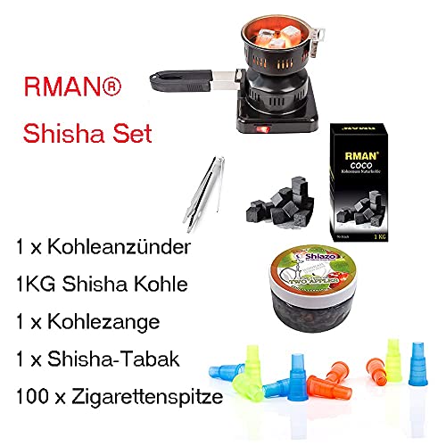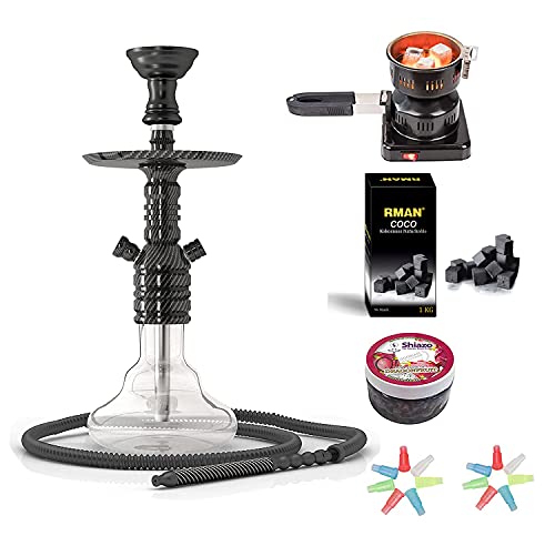 RMAN® Shisha Set Wasserpfeife Mini Aluminium 38cm Hookah mit Kohleanzünder Schlauch Naturkohle Alufolie Kaminkopf Zange…