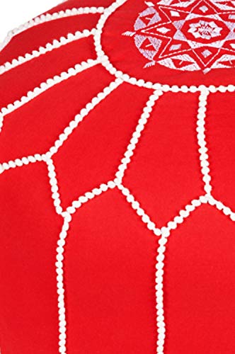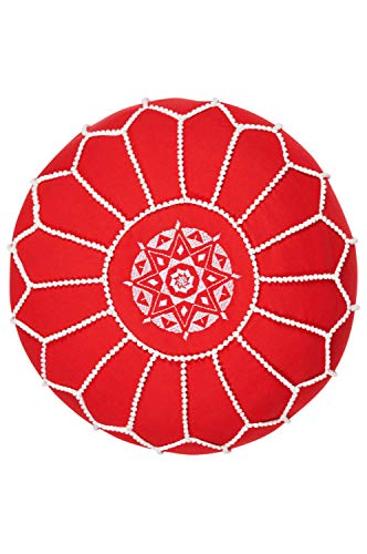 Größe befüllt: 45cm Durchmesser 35cm hoch | Material: Baumwolle | Farbe Bezug: Rot | Farbe Stickereien: Weiß | Zustellung beinhaltet Kissenbezug und eine innenhülle in Weiß für Ihre Füllung | Das Füllmaterial ist für das Gewicht diese Sitzkissen verantwortlich | Wir empfehlen als Füllmaterial Altkleider Styropor-kügelchen oder Holzwolle, Für Yoga Übungen empfehlen wir ganze Buchweizenschalen | Füllung ca. 60L