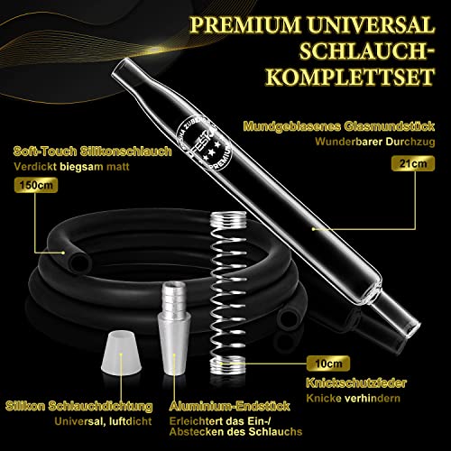 [Premium Shisha Schlauch Komplettset]: DFESKAH Shisha Schlauch mit Glasmundstück Set enthält: Glas Mundstück aus Borosilikatglas, 150cm schwarz matt Silikonschlauch, Aluminium Adapter-Endstück, universal Schlauchdichtung, Knickschutzfeder. Dieses Schlauchset ist gut geschützt in einer edlen Geschenkbox und ist das perfekte Geschenk für Shisha-Liebhaber.