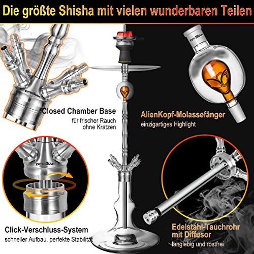 【Elegantes Design】Die Shisha-Teile jedweder 100% V2A-Edelstahl sind robust, langlebig und rostfrei. Der Molassefänger ist jedweder hochwertigem Borosilikatglas, schützt die Rauchsäule vor auslaufender Molasse. Der exquisite Molassefänger ist bekannt als optisch ein einzigartiges Highlight. Der Boden der Bowl hat eine LED-Aussparung. Installieren Sie eine LED, um nachts die coolste Shisha zu genießen.