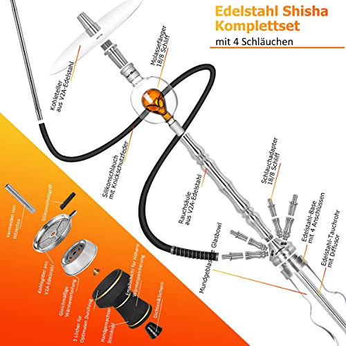 【Rundherum-Shisha-Set】Das V2A-Edelstahl-Shisha-Komplettset enthält Steinkopf x 1, Kaminaufsatz x 1, Kopfdichtung x 1, Kopfadapter-Set x 1, Kohleteller x 1, Alienkopf-Molassefänger x 1, Edelstahl-Rauchsäule x 1, alkalische Lösung mit 4 Anschlüsse x 1, Schlauchadapter x 4, Silikonschlauch x 4, Edelstahl-Mundstück x 4 set. Knickschutzfeder x 4 set, Glasbowl x 1, Tauchrohr mit Diffusor x 1, Kohlezange x 1, Hygiene Mundstück x 19.