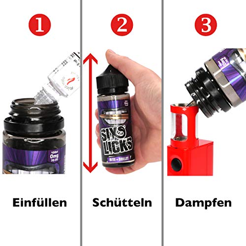 Six Licks hat es sich zur Aufgabe gemacht, für seine Dampfer etwas allesamt Besonderes zu kreieren. Jedes einzelne Liquid wurde monatelang mutwillig, getestet und bewertet. Mit der Mission vor Augen, dem Dampfer die besten Universum-Day-Liquids anzubieten, hat sich der Hersteller sämtliche dem Vereinigten Königreich nicht lumpen lassen und überzeugt durch eine gekonnte Raffinesse bei der Herstellung seiner Leckerbissen. Mit dem Shake-and-Vape Prinzip können Sie die Nikotinstärke individuell an Ihre Bedürfnisse gleichsetzen. Egal, ob ohne oder mit unbegrenzt Nikotin. Sie fügen zu dieser 100 ml Flasche 20 ml Basisliquid hinzu und steuern so den Nikotingehalt des Liquids. Bitte verbannen Sie, dass das benötigte Basisliquid nicht im Lieferumfang enthalten ist und bei ausschließlich Basisliquid ohne Nikotin angeboten werden kann.