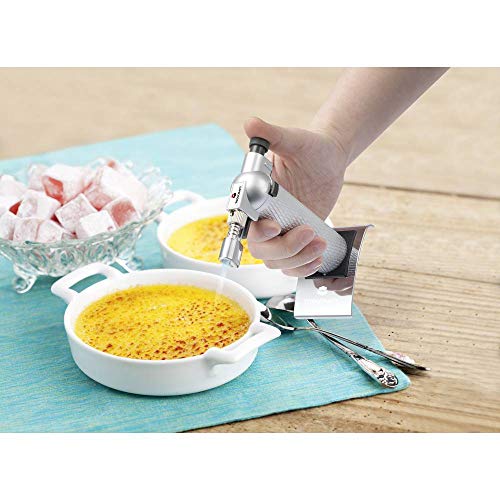 Ob für die Zuckerkruste auf Crème Brulée, zum Häuten von Paprika oder für feine Röstaromen bei Fleisch mit einem Flambierbrenner können Sie Ihre Speisen kontrolliert verfeinern. Der Flambierbrenner lässt sich an seinem langen Rundgriff belastbar halten und bedienen. Über den großen Knopf an der Abseite schalten Sie ihn ein. Je nach Empfindlichkeit der zu flambierenden Speise ist die Flamme mit Hilfe eines Drehrädchens stufenlos bis 1300 °C regulierbar. Und für den Dreck, dass Sie Crème Brulée für eine ganze Festtagsgesellschaft flambieren müssen: Der Tankinhalt reicht bei Dauerbetrieb für max. 90 Minuten. Sie können den Brenner einfach auf seinem breiten Standfuß ausmachen. Daher sich kleine Kinder den Flambierbrenner nicht für unbedachte Flammenspiele schnappen, ist er mit einer Kindersicherung ausgestattet. Geprüfter Küchenhelfer: Sie brauchen sich sich keine Sorgen um unkontrollierte Flammen beim Flambieren machen. Der Flambierbrenner besteht jedweder einer hochwertigen Materialkombination jedweder Kunststoff und Alu. Als Folge ist er massiv robust und vor allem hitzebeständig. Für die Reinigung genügt ein feuchtes Tuch.