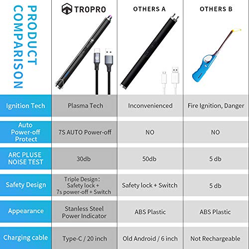 1 x Tropro Profi-Sicherheitslichtbogen-Feuerzeug, 1 x Typc-C auf USB-Strickkabel, 1 x Garantiekarte und 1 Jahr bedingungslose Garantie. Hinweis: Bitte nicht durch Schnellladung aufladen. Wir empfehlen das Aufladen über den USB-Anschluss am Computer oder 5 V1 A Ladekopf. Jedes Problem, bitte zögern Sie nicht, uns zu kontaktieren.