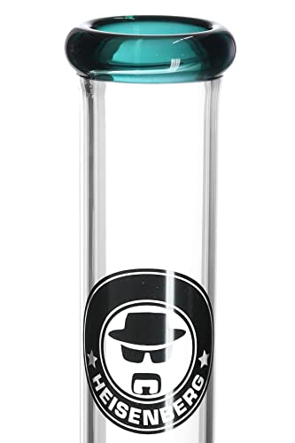Die Maße dieser Glasbong Twentyfour Seven in Zylinderform von Heisenberg sind: Höhe 50cm | Wandstärke 5mm | Schliffgröße 18.8mm | Durchmesser ca. 5cm | Standard-Kopf 18.8 | Eiskerben | rundes Heisenberg-Logo auf dem Bonghals.