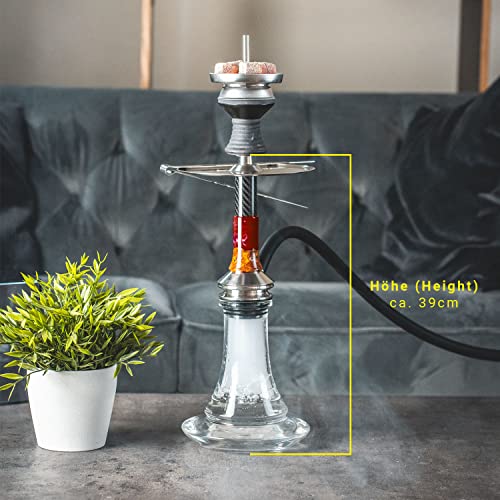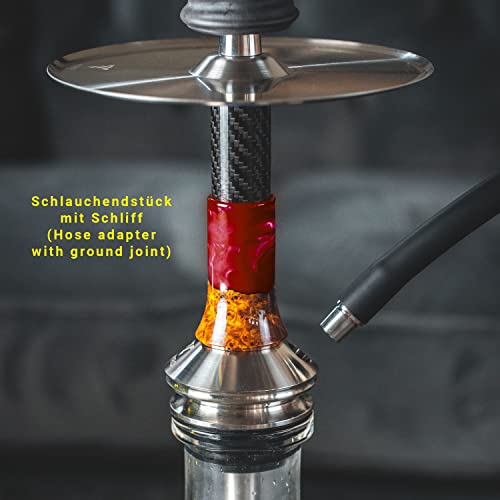 Die neue kleine kompakte Steck-Shisha von VYRO qua ultimates Shisha Starter Set. Die VYRO – Penta ist eine kleine (ca. 39 cm) kompakte Steck-Shisha sämtliche V2A Edelstahl, echtem Carbon, Epoxidharz und Holz. Der Blow Off befindet sich unten vom Shisha-Teller und sorgt an Stelle ein schnelles und angenehmes Entlüften. Der Shisha-Rauch prallt am Kohleteller ab und wird nach hinunter geleitet. Um dir einen schnellen Austausch deines Shisha-Kopfes zu ermöglichen, kann der Shisha-Teller bequem durch den Schliffadapter von der Rauchsäule entfernt werden. Zusätzlich kann z.B. ein Molassefänger (18/8 Schliff) integriert werden. Der geschliffene Kohleteller der VYRO – Penta hat am äußeren Rand eine kleine Erhöhung, folglich die Kohle auf dem Shisha-Teller nicht herunterfallen kann. Durch die Erhöhung in der Mitte des Kohletellers kann die Kohle nicht an die Kopfdichtung gelangen, wodurch diese geschützt ist. Der Purge ist in der Tiefe dem Shisha-Teller in dieser Erhöhung versteckt. Lieferumfang der VYRO – Penta: 1x Kopfadapter sämtliche V2A Edelstahl 1x Gummikopfdichtung schwarz 1x Kohleteller sämtliche V2A Edelstahl mit VYRO-Logogravur 1x Schliffadapter (18/8 auf M16x1) sämtliche V2A Edelstahl 1x Purge sämtliche V2A Edelstahl mit 18/8 Schliff oben 1x Sleeve bestehend sämtliche Carbon, Epoxidharz und Holz (austauschbar) 1x Edelstahlrohr sämtliche V2A an Stelle Rauchsäule 1x Lauge (mit VYRO-Logogravur) mit einem Schlauchanschluss sämtliche Edelstahl V2A 1x Schlauchendstück sämtliche Edelstahl V2A 7x Edelstahlkugel und 7x POM-Kugel 1x Gummidichtung an Stelle Bowl 1x Tauchrohr sämtliche V2A Edelstahl 1x Diffusor sämtliche V2A Edelstahl, beidseitig verschraubbar 1x Steck-Bowl (Innendurchmesser 45 mm) 1x Beileger mit Aufbauanleitung 1x VYRO – Penta Carbon Hybrid Mundstück 30cm 1x Silikonschlauch schwarz 1x Tonkopf mit Kaminaufsatz 1x Shisha Kohlezange Wichtig: Der Materialanteil (Holz & Epoxidharz) im Sleeve kann vom Produktbild abschweifen. Kleine Luftbläschen im Glas können abspielen und sind kein Reklamationsgrund.